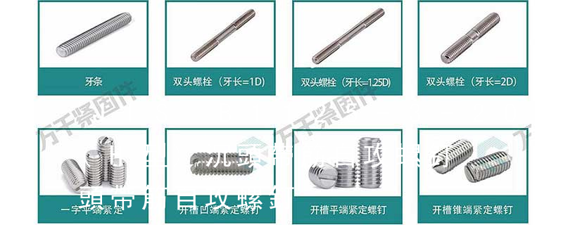 螺栓有:1、方頭螺栓,2、半圓頭方頸螺栓,3、十字槽盤頭螺釘,4、內六角沉頭螺釘,5、方螺母C級,6、蝶形螺母,7、六角頭螺栓,8、十字槽盤頭自攻螺釘。大小有M18、M6、M8、M16、M10、M12、M14、M20等型號。通常用 自攻螺釘選用通常的規則:自攻為4個螺距,機械螺釘為3個螺距,這是最小的旋合長度,按照實驗的條件會有所加長。每一個自攻螺釘都是由頭部、桿部和桿部末端三部分組成的。每一個自攻螺釘的構成都有四大要素:頭部形狀、扳